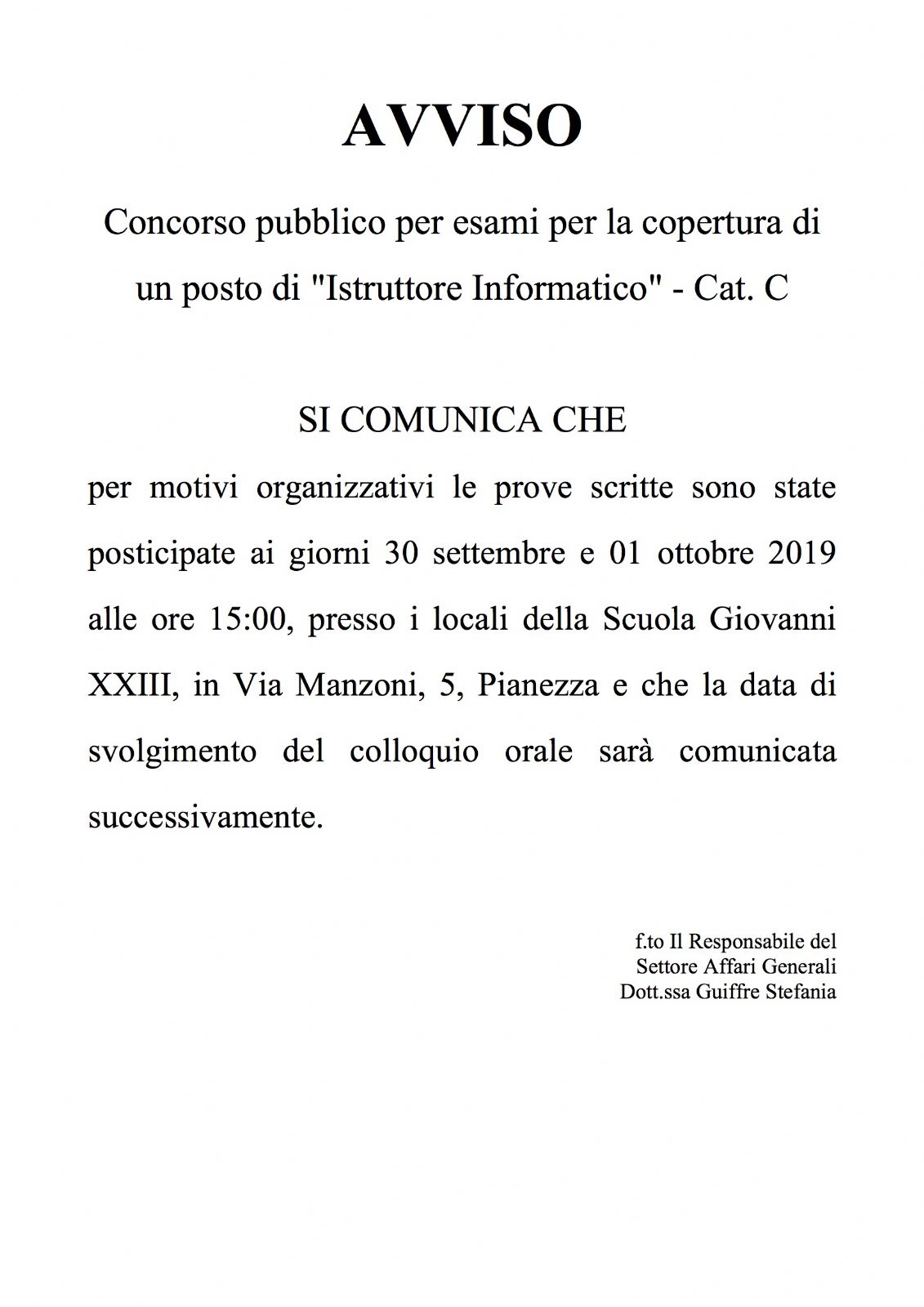 BANDO DI CONCORSO PUBBLICO PER ESAMI PER LA COPERTURA DI N. 1 (UNO) POSTO A TEMPO INDETERMINATO E PIENO DI "ISTRUTTORE INFORMATICO" - CAT. "C" .