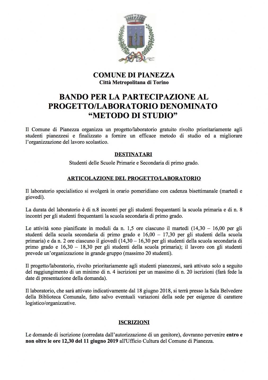 Il Comune di Pianezza organizza un progetto/laboratorio gratuito rivolto prioritariamente agli studenti pianezzesi e finalizzato a fornire un efficace metodo di studio ed a migliorare l’organizzazione del lavoro scolastico.