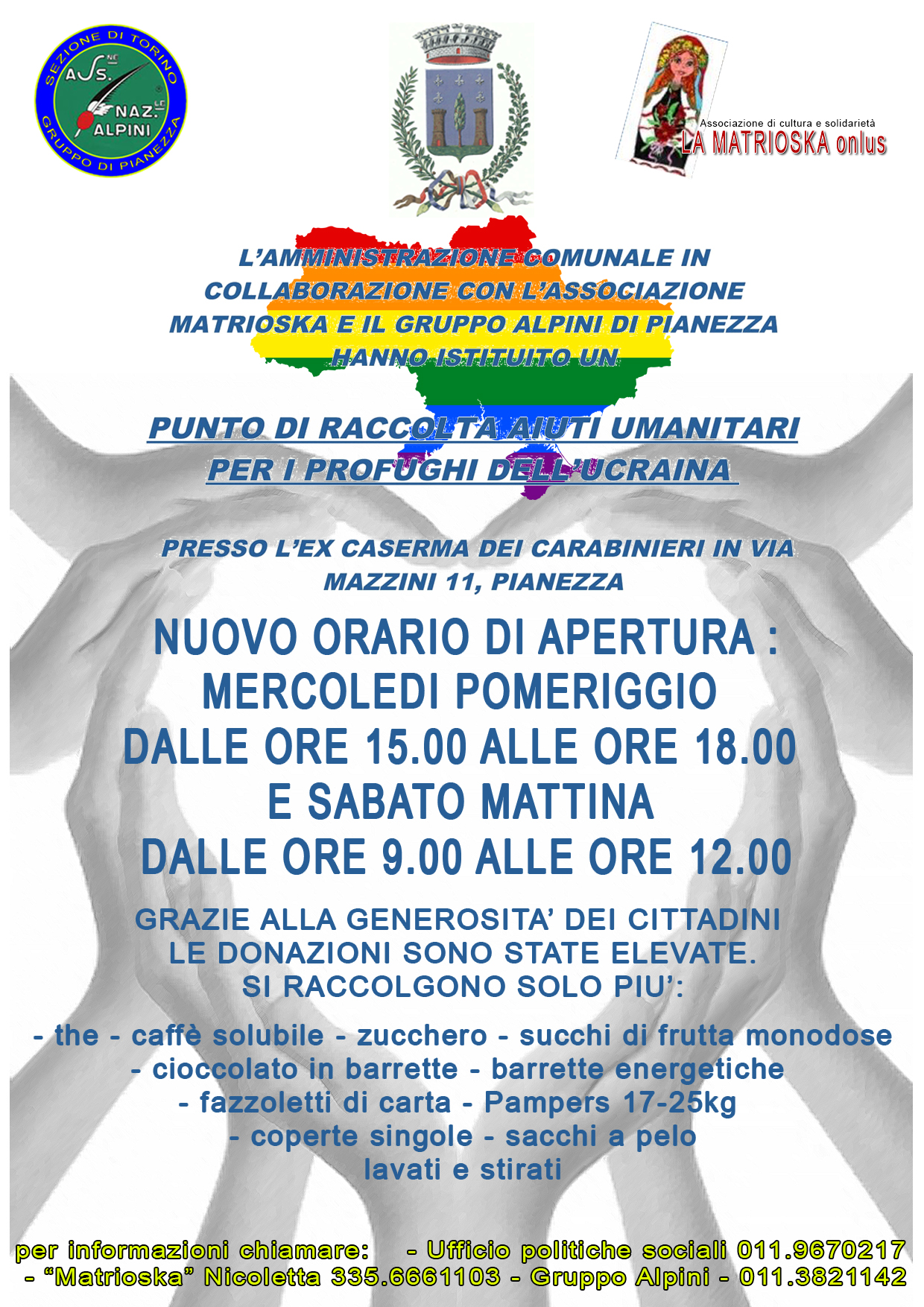 Punto di raccolta aiuti umanitari per i profughi dell’Ucraina presso l’ex caserma dei Carabinieri in via Mazzini 11, Pianezza con orario: