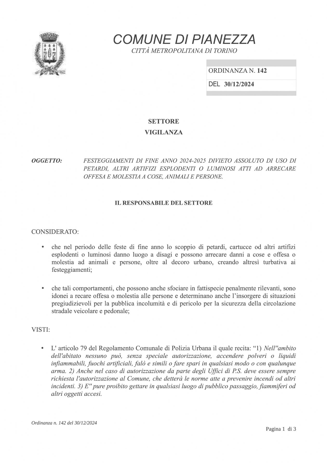 Divieto assoluto di uso di petardi, altri artifizi esplodenti o luminosi atti ad arrecare offesa e molestia a cose animali e persone.