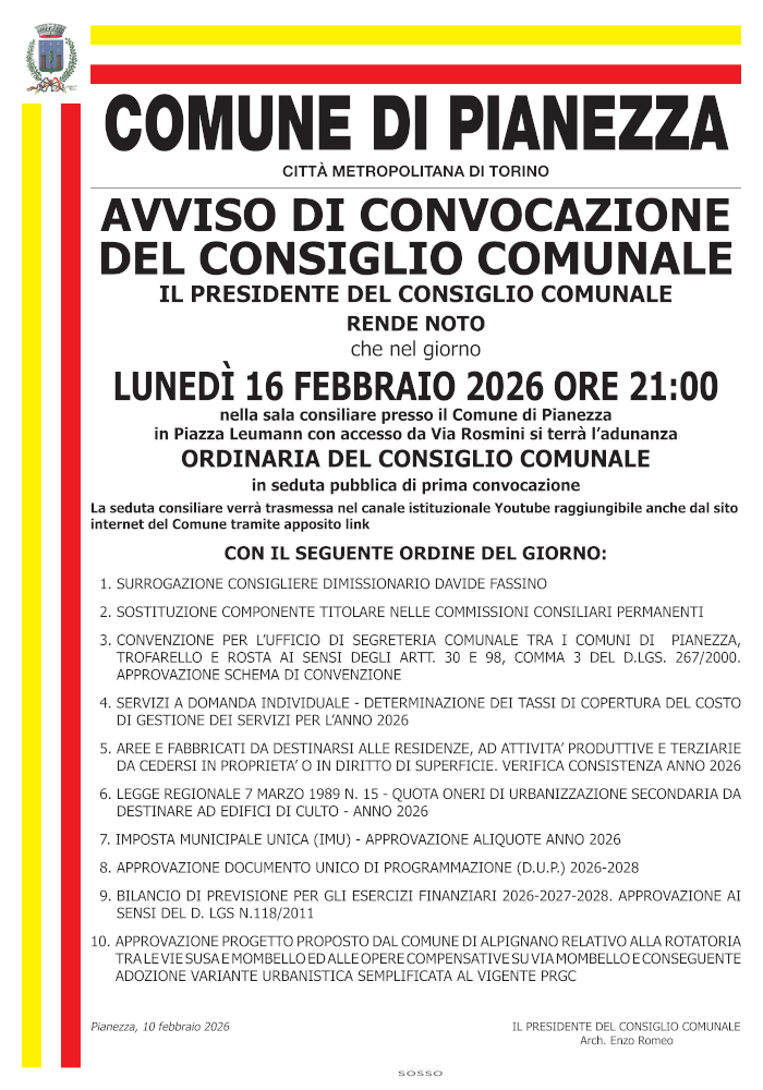 nella sala consiliare presso il comune di pianezza in piazza leumann con accesso da via rosmini si terrà l’adunanza ordinaria del consiglio comunale in seduta pubblica di prima convocazione