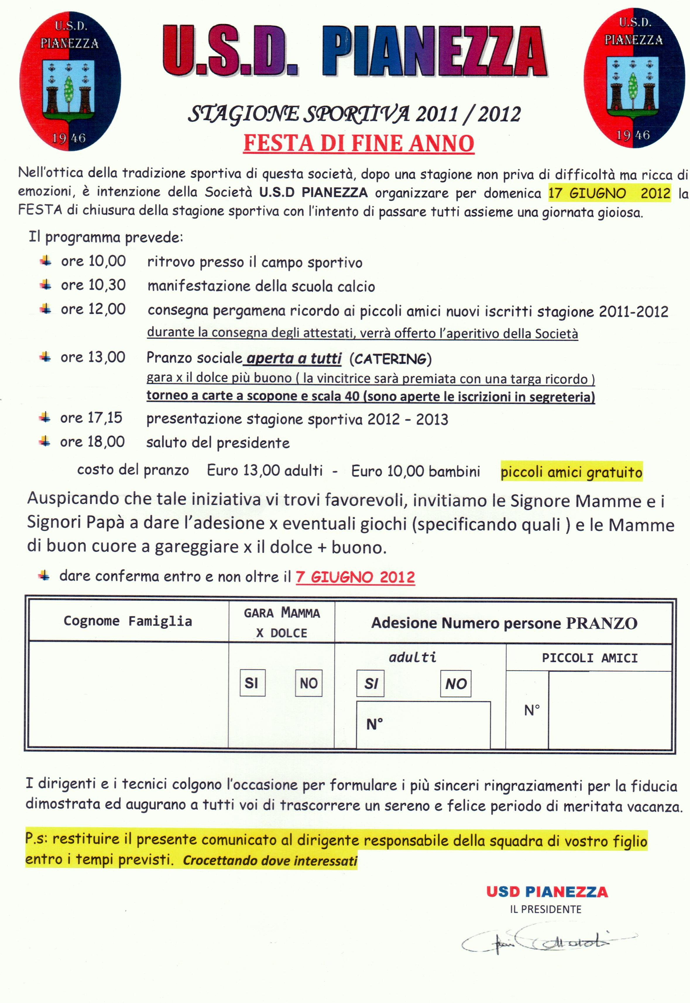 La società USD Pianezza organizza la festa di chiusura della stagione sportiva.