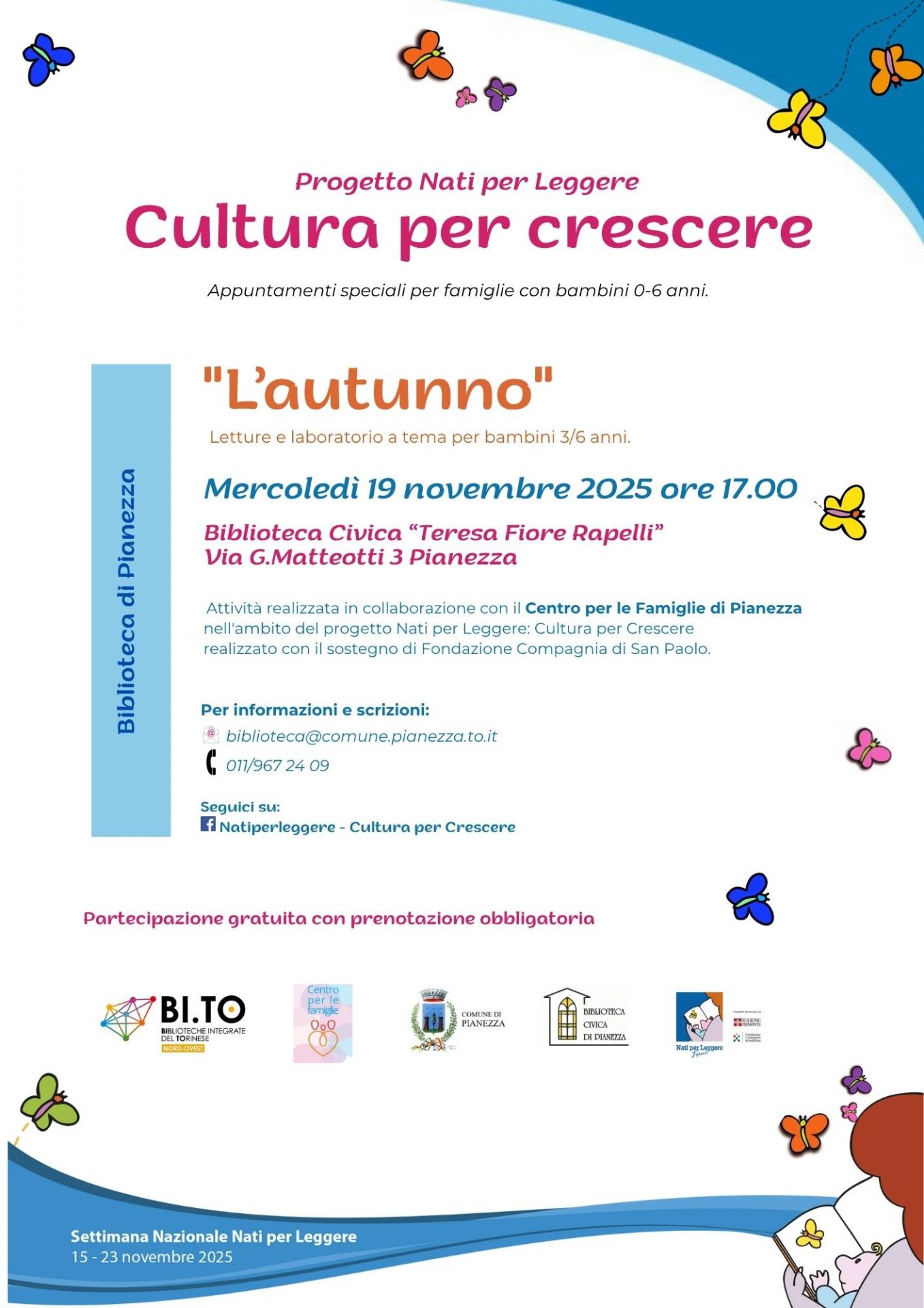 Mercoledì 19 novembre alle ore 17,00 presso la biblioteca civica "T.Fiore Rapelli" di Pianezza, via G.Matteotti 3. Attività di letture e laboratorio a tema, rivolto a bambini dai 3 ai 6 anni, proposta nell'ambito del progetto "Nati per Leggere - Cultura per crescere" del sistema bibliotecario BI.TO. Area Nord-Ovest.