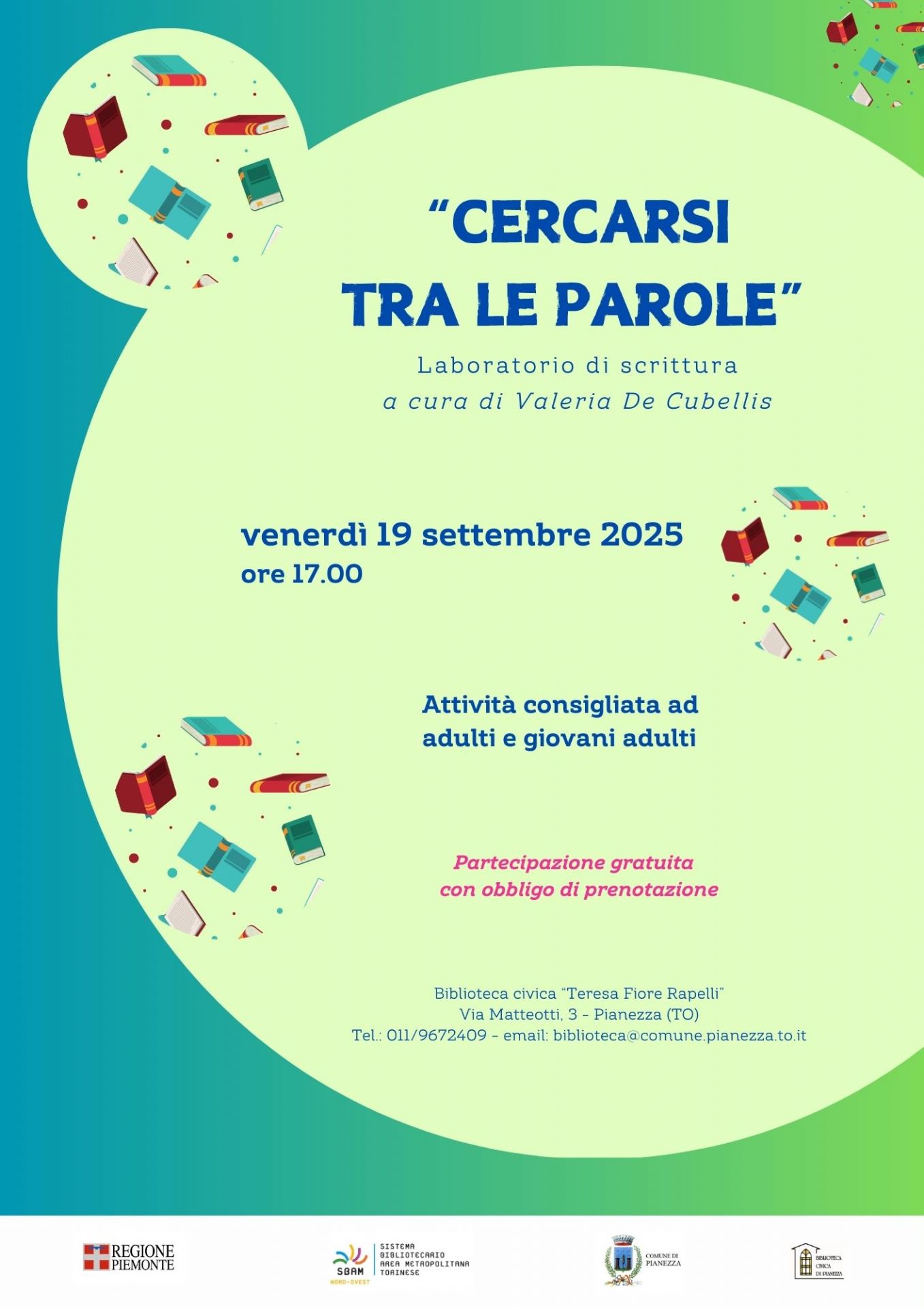 per adulti e giovani adulti “Cercarsi tra le parole” a cura di Valeria de Cubellis. Attività proposta dallo SBAM con il contributo della Regione Piemonte. Partecipazione gratuita con prenotazione obbligatoria: 011/9672409 –