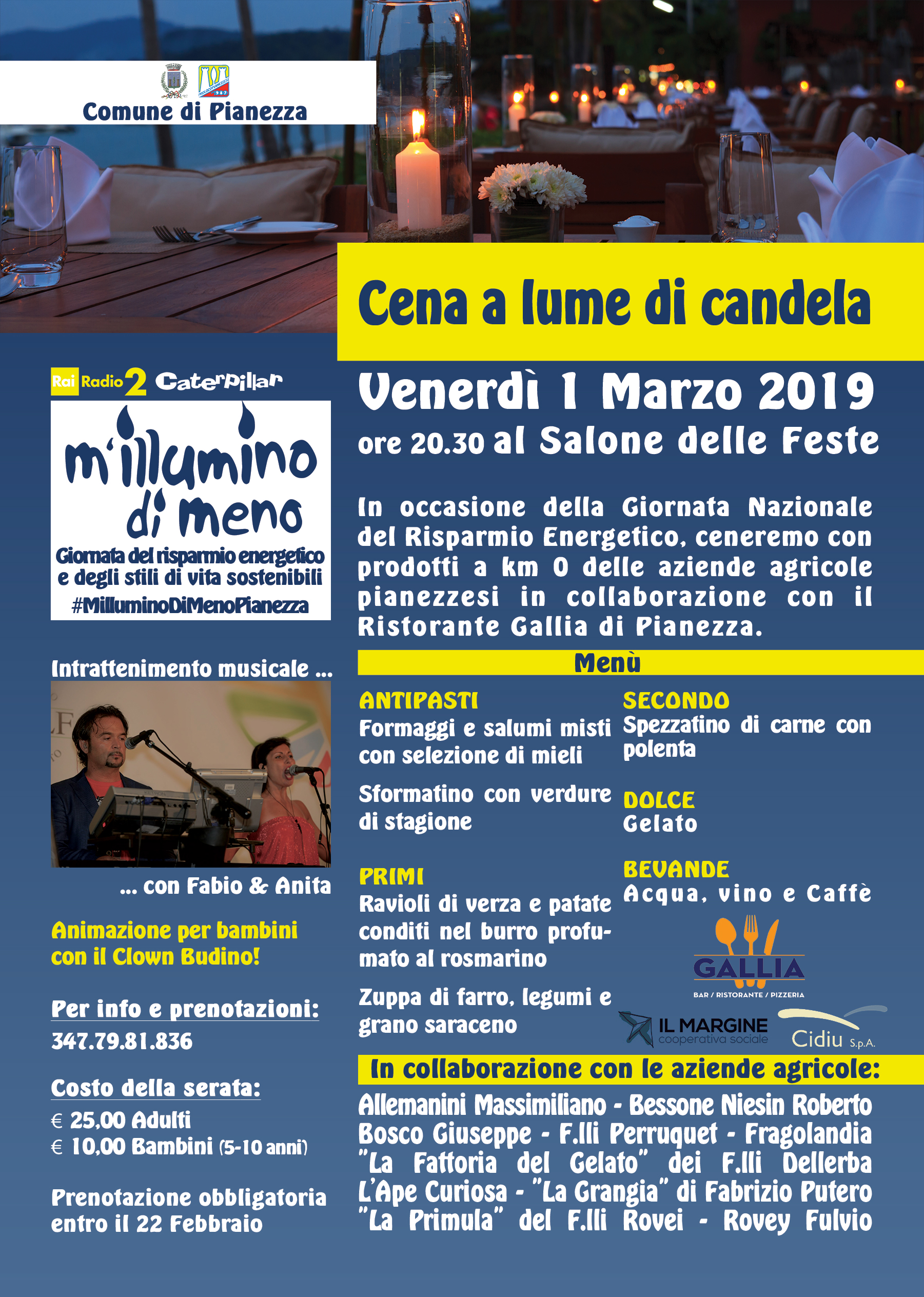 collaborazione con la Proloco, il ristorante Gallia e la Coop. Il Margine, organizza per venerdì 1 marzo alle ore 20.30 presso il Salone delle Feste di Pianezza, la terza edizione della "Cena a lume di candela" , con i prodotti a "km zero" delle aziende agricole locali (per info e prenotazioni www.comune.pianezza.to.it).