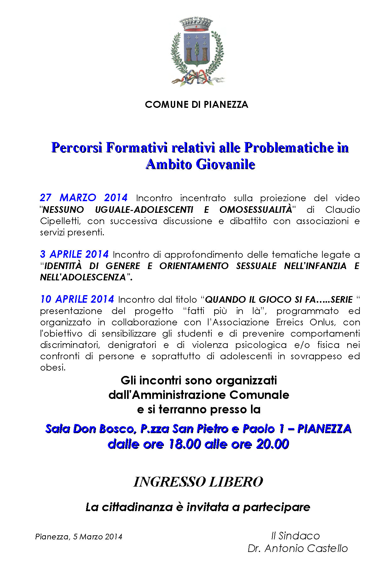 Gli incontri sono organizzati dall'Amministrazione Comunale e si terranno presso la Sala Don Bosco, P.zza San Pietro e Paolo 1 – PIANEZZA