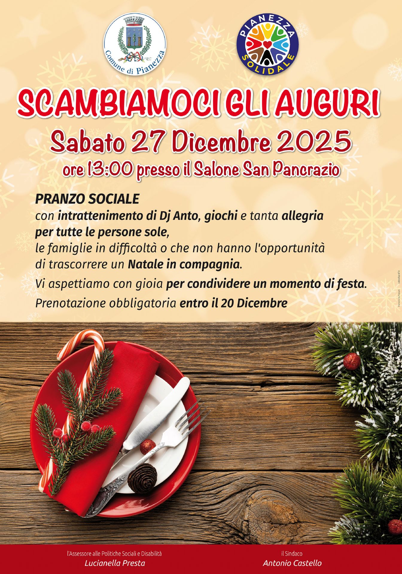 PRANZO SOCIALE, con intrattenimento di Dj Anto, giochi e tanta allegria per tutte le persone sole, le famiglie in difficoltà o che non hanno l'opportunità di trascorrere un Natale in compagnia.