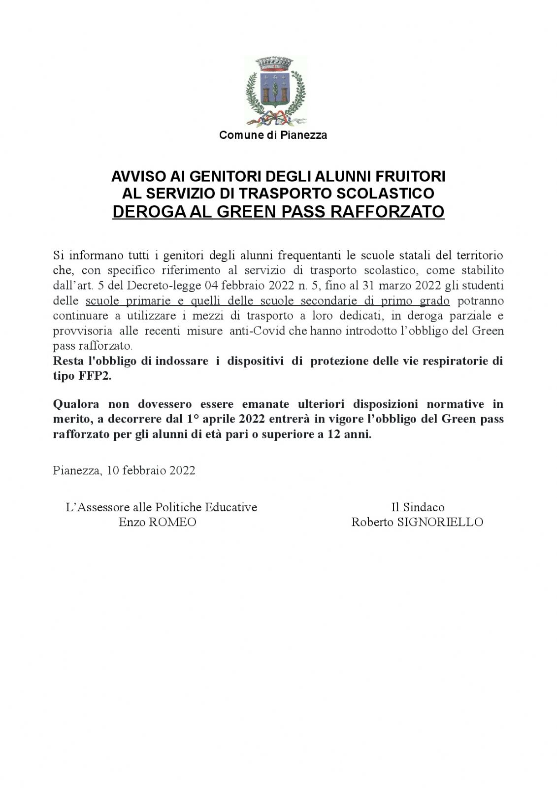 AVVISO AI GENITORI DEGLI ALUNNI FRUITORI AL SERVIZIO DI TRASPORTO SCOLASTICO DEROGA AL GREEN PASS RAFFORZATO