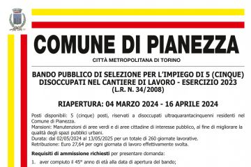 Leggi tuttoBando pubblico di selezione per l'impiego di 5 (cinque) disoccupati nel cantiere di lavoro per persone disoccupate – azione 1 - periodo 2023/2024