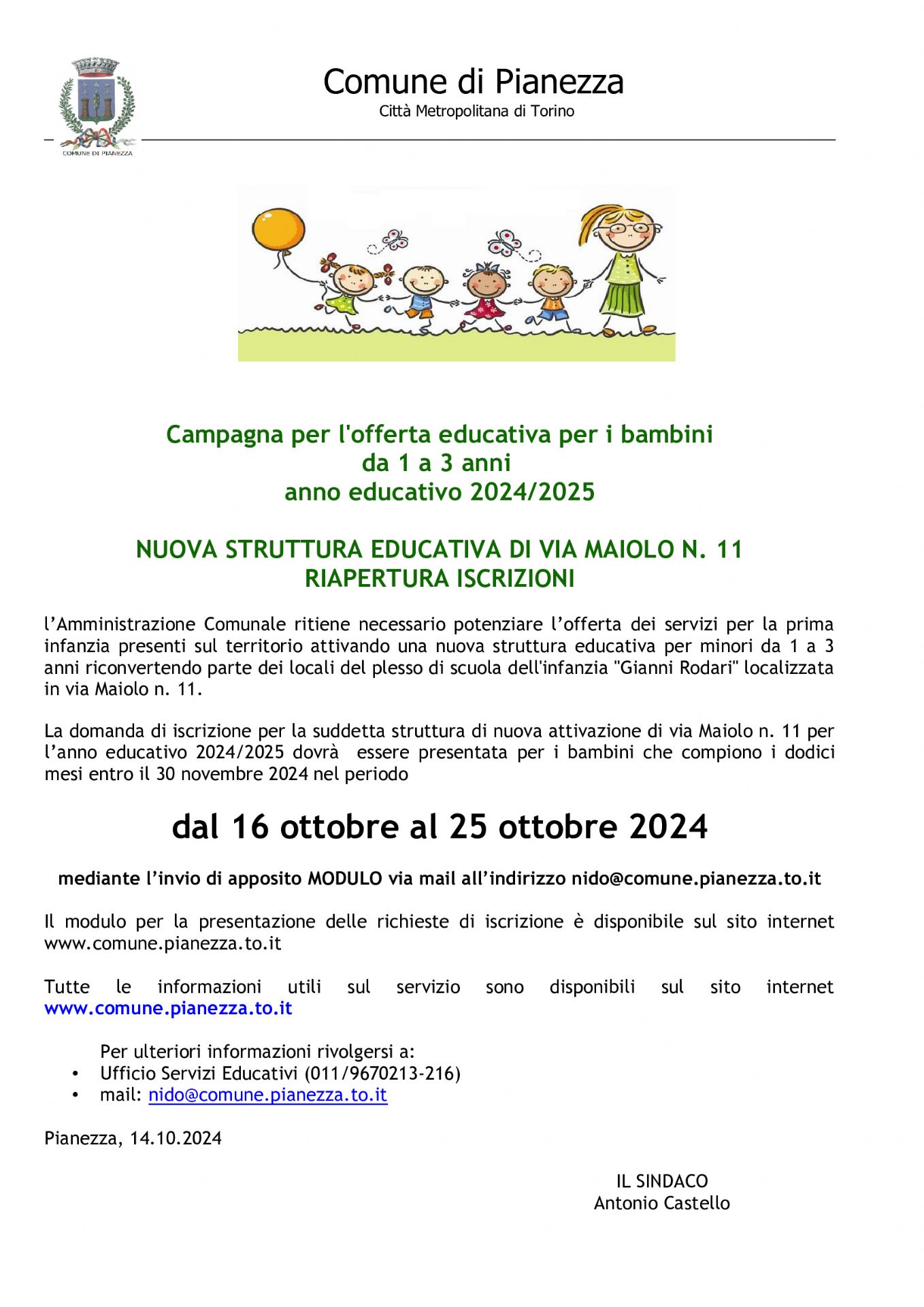 Si informano le gentili famiglie che sono riaperte le iscrizioni per la nuova struttura educativa di Via Maiolo 11 a.e. 2024/2025 come da informativa allegata.