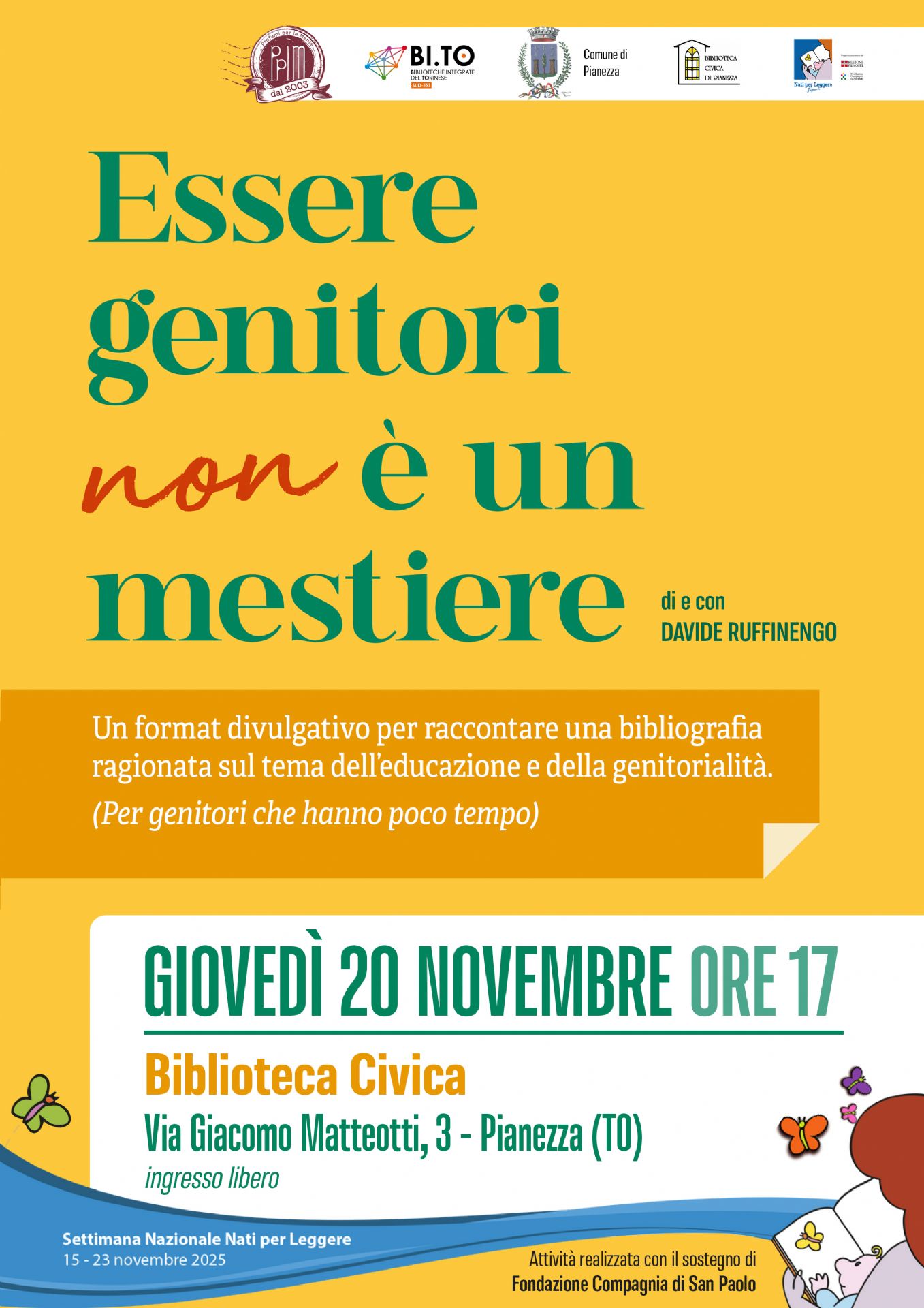 Giovedì 20 novembre alle ore 17,00 presso la biblioteca civica "T.Fiore Rapelli" di Pianezza, via G.Matteotti 3. Un format divulgativo per raccontare una bibliografia ragionata sul tema dell'educazione e della genitorialità. Attività rivolta ai genitori nell'ambito del progetto "Nati per Leggere - Cultura per crescere" del sistema bibliotecario BI.TO. Area Nord-Ovest.