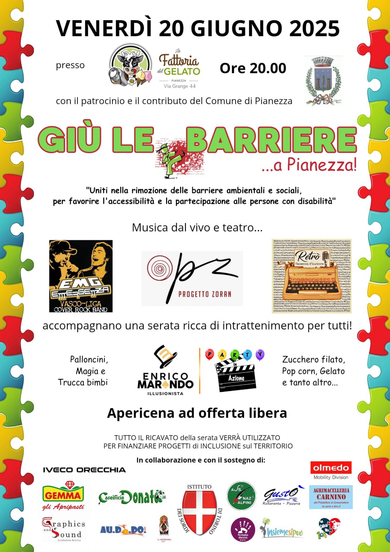 Venerdì 20 giugno dalle ore 20:00, con il patrocinio e contributo del Comune di Pianezza si terrà un evento benefico a sfondo musicale culturale e sociale, presso la Fattoria del Gelato dal titolo “Giù le barriere … a Pianezza”. Un’iniziativa solidale per promuovere la rimozione delle barriere ambientali e sociali, al fine di favorire l’accessibilità e la partecipazione alle persone con disabilità.
