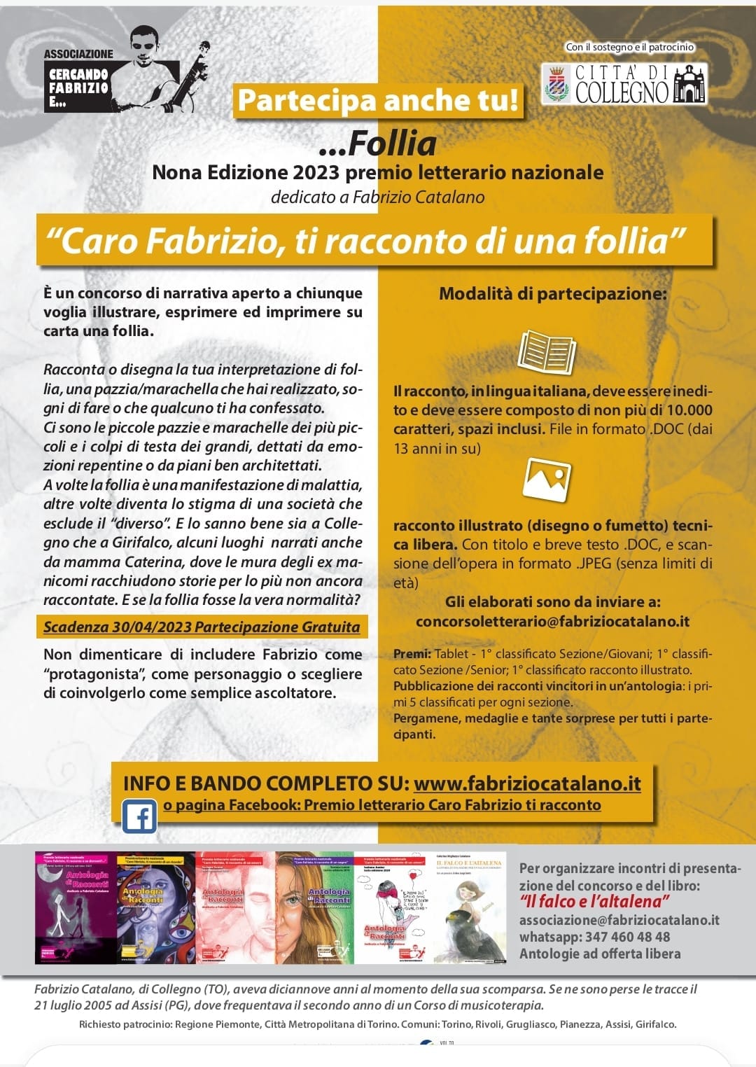 “Caro Fabrizio, ti racconto di una follia” è un concorso di narrativa aperto a chiunque voglia esprimere ed imprimere su carta la propria declinazione di follia, in forma scritta o illustrata.