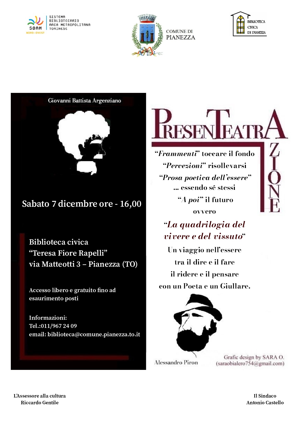 Presentazione teatrale dei libri di Giovanni Battista Argenziano. L'autore sarà affiancato dall'attore Alessandro Piron, per un incontro con il pubblico originale e coinvolgente. Sabato 7 dicembre, ore 16.00 presso la biblioteca civica "T. Fiore Rapelli", via Matteotti 3 - Pianezza.